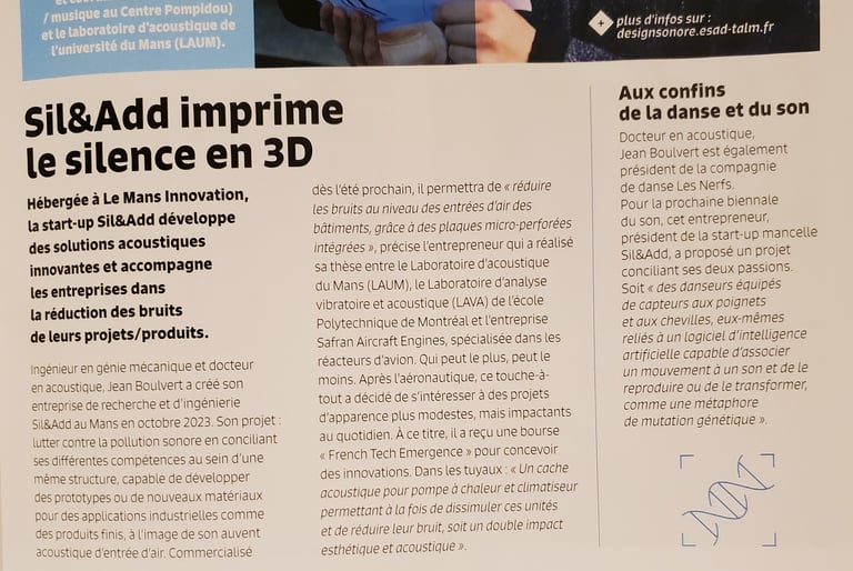 This newsletter from Le Mans Innovation presents the entrepreneurial career of Jean Boulvert, founder of Sil&Add, an innovative company specialising in the development of acoustic solutions using additive manufacturing, acoustic metamaterials and digital simulation. Through his research career, Jean Boulvert has acquired cutting-edge expertise in noise reduction, which he now applies in a variety of sectors. Support from Le Mans Innovation has enabled him to make the transition from researcher to entrepreneur, with training in business management and fund-raising. Sil&Add is currently in the process of launching its first patented product: an acoustic canopy for window air inlets, designed to reduce external noise while optimising ventilation and aesthetic performance. Other innovative projects, open to technical and financial partnerships, are also under development. At the same time, Sil&Add offers tailor-made development services to other companies, enabling them to improve the acoustic performance of their products.