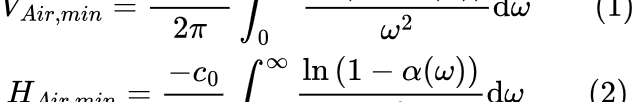 Pour définir les indices de performance suivants, il est nécessaire de définir une nouvelle grandeur généralisant l'Eq. 2. Il s'agit de la hauteur d'air théorique minimale pour atteindre un coefficient d'absorption donné sur la plage de fréquences [a ; b]. Autrement dit, le coefficient d'absorption est considéré comme nul en dehors de [a ; b] :